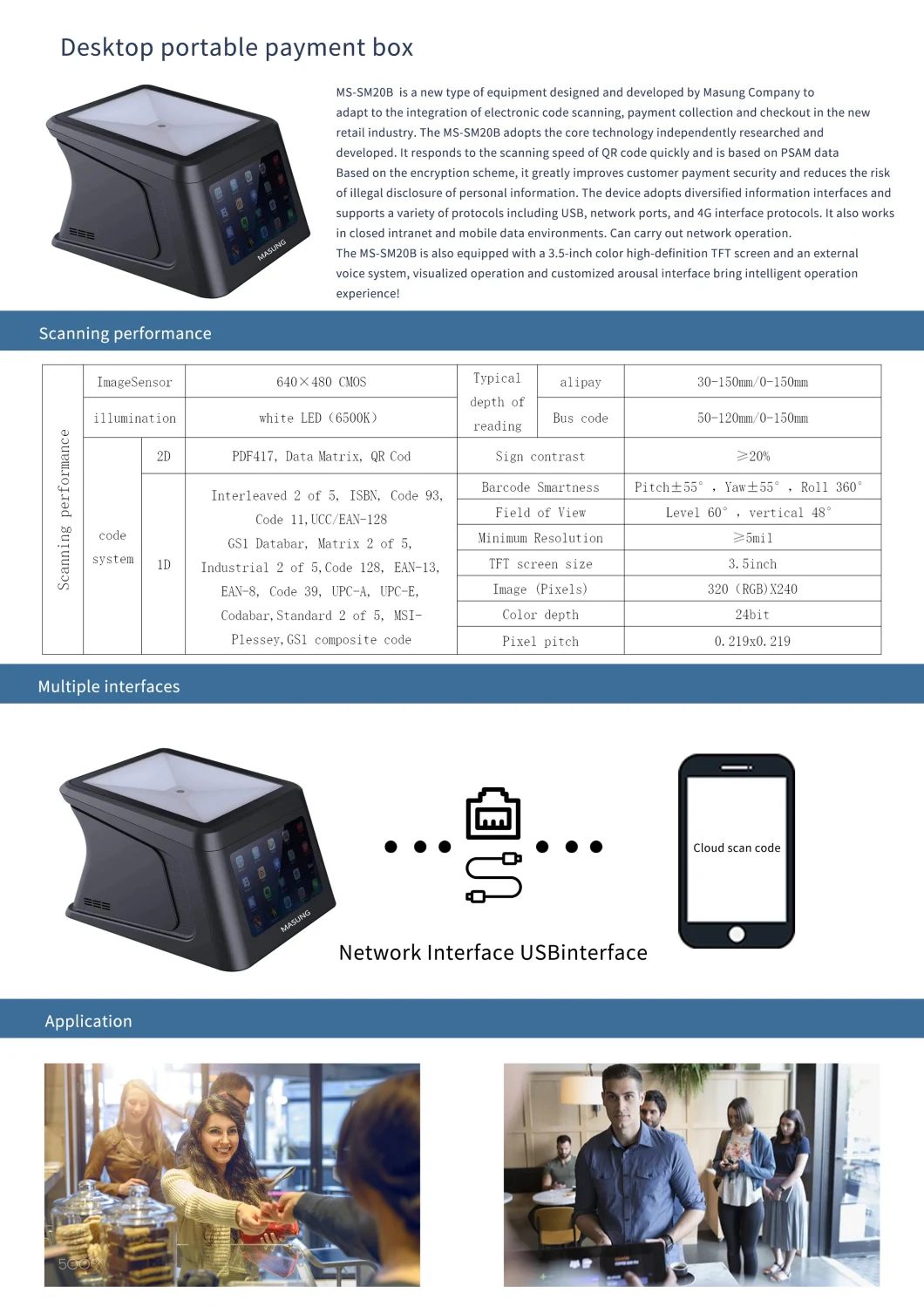 MS-SM20 series is a new type of equipment designed and developed by Masung Company to adapt to the integration of electronic code scanning, payment collection and checkout in the new retail industry. The MS-SM20 series adopts the core technology independently researched and developed. It responds to the scanning speed of QR code quickly and is based on PSAM data